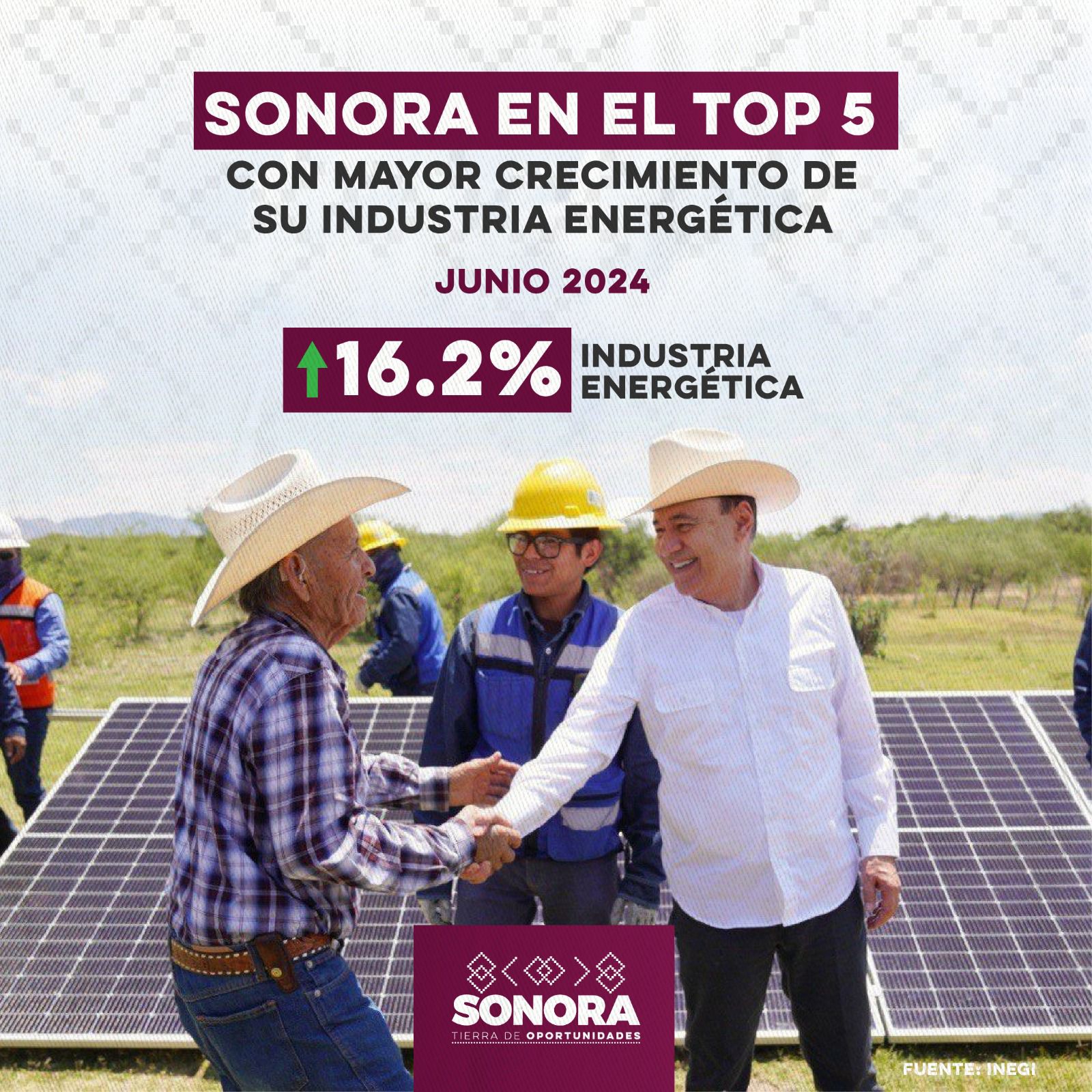 El mandatario estatal mencionó que, con base en datos del estudio de Indicador Mensual de la Actividad Industrial del Instituto Nacional de Estadística y Geografía (INEGI), en junio de 2024, Sonora registró un impresionante aumento del 16.2 por ciento en su producción energética, ubicándose entre los cinco estados con mayor dinamismo en el sector.