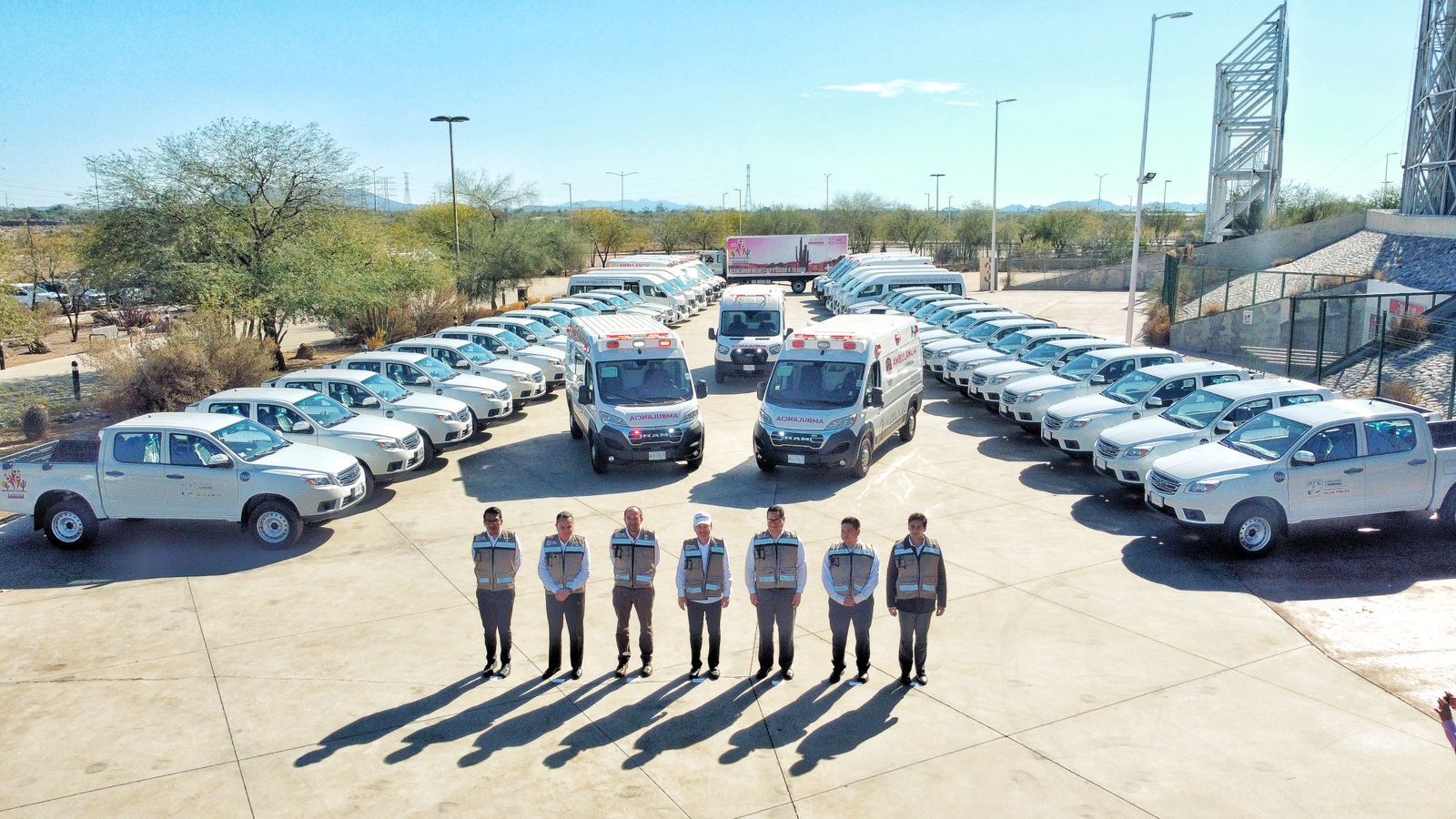 El gobernador Durazo indicó que, en coordinación con la Secretaría de Salud Pública, se cristaliza en Sonora otro resultado positivo de la federalización de los servicios de salud a la población, con la entrega de 25 vehículos tipo Pick Up doble cabina, nueve ambulancias, seis Urvan, dos camiones y 606 uniformes para los trabajadores, a fin de ampliar la cobertura de atención en beneficio de la población que vive en condiciones vulnerables.