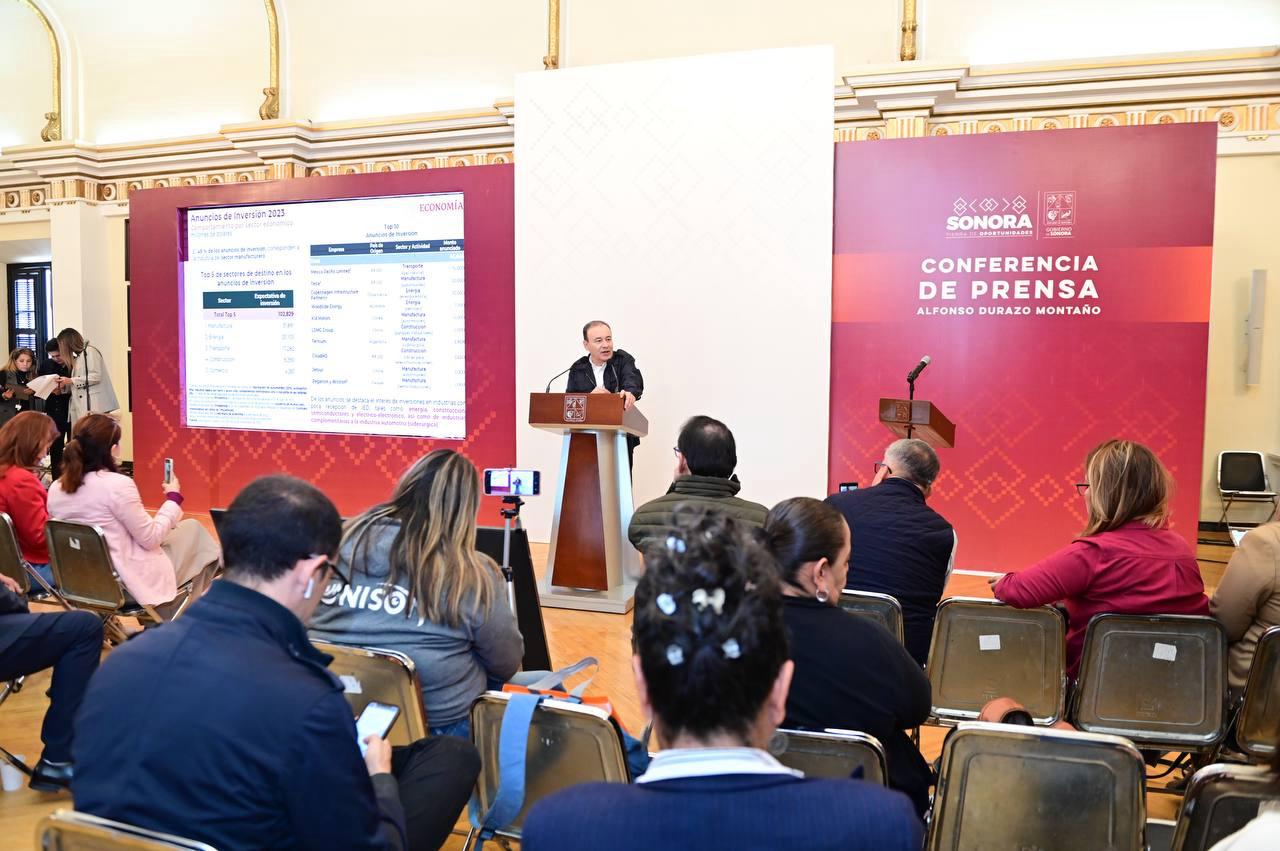 Así mismo, Sonora se localiza en el tercer lugar de captación de inversión extranjera, se ha roto el promedio anual de los últimos años que ha sido de 300 millones de dólares; además está aumentando su liderazgo dentro de la frontera norte como la entidad que más crece en minería, generación eléctrica, manufactura y construcción.