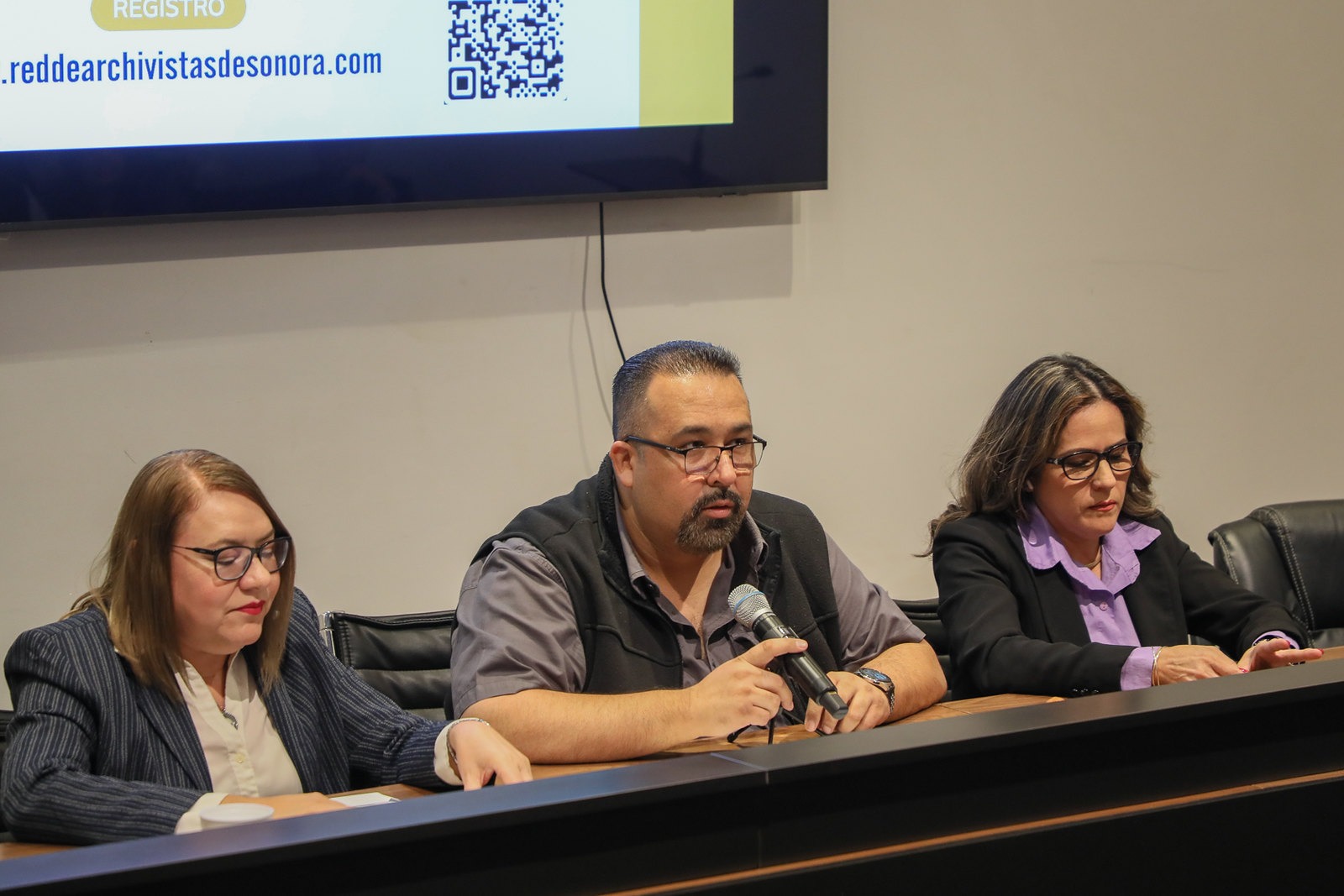En la rueda de prensa, Karina Mungarro Garibay, coordinadora provisional de Archivos del Congreso local, estuvo acompañada por Patricia Ríos García, Homar Arturo Moreno Ramos, Rosalina Núñez Márquez y Concepción Moya Grijalva, presidenta, secretario, tesorera y encargada de seguimiento y vigilancia, respectivamente, de la Red de Archivistas de Sonora.