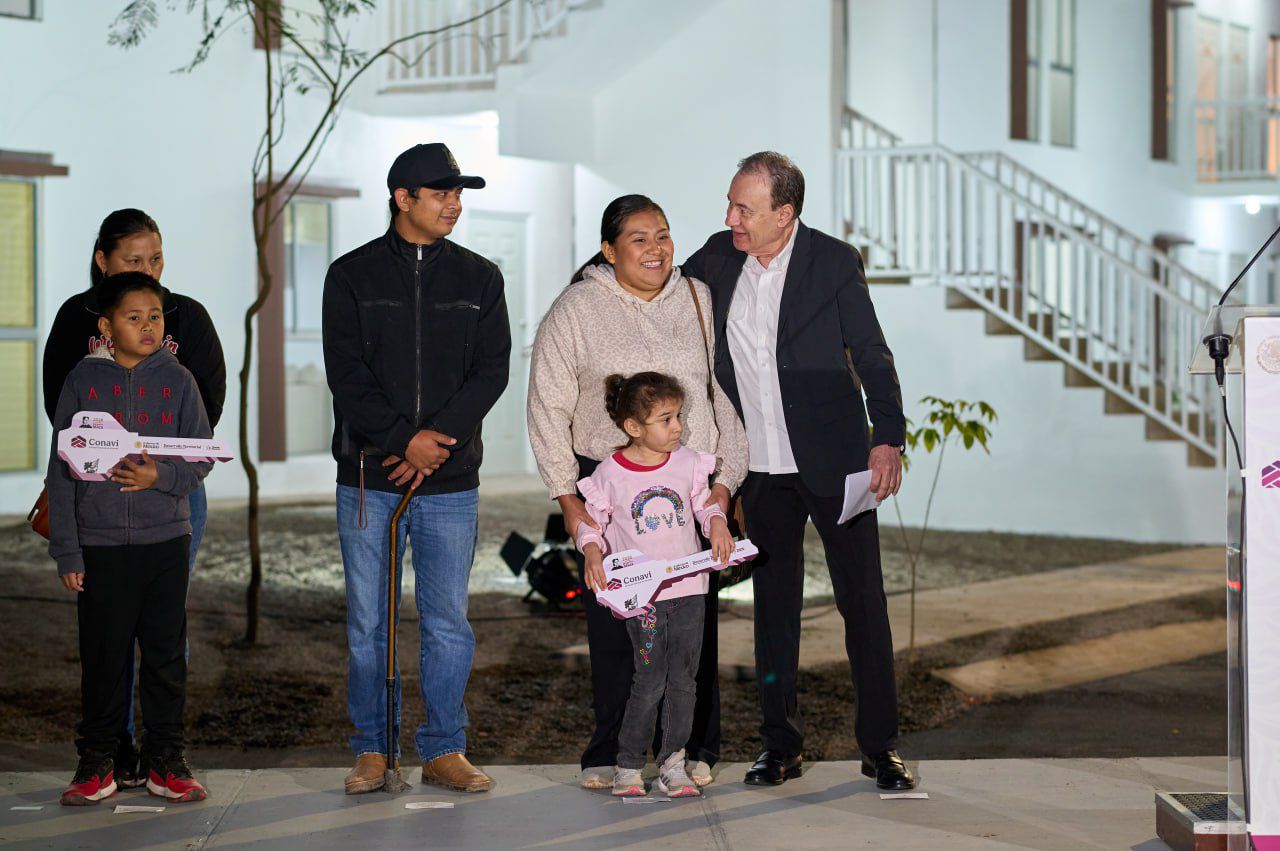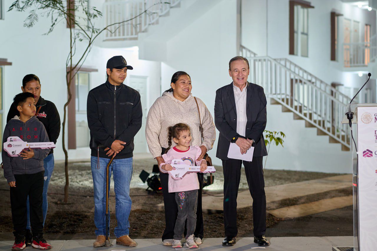 En el evento de entrega de las primeras casas, que se llevó a cabo durante un enlace en vivo a la Conferencia Matutina de la presidenta Claudia Sheinbaum, el mandatario estatal resaltó que la meta en Sonora del Programa de Nacional de Vivienda para el Bienestar, incrementó de 34 mil casas a 65 mil para el final de la presente administración federal, gracias al compromiso del Gobierno de México con los sonorenses y a la voluntad del Gobierno de Sonora para entregar la totalidad del terreno requerido para la construcción de los complejos habitacionales.