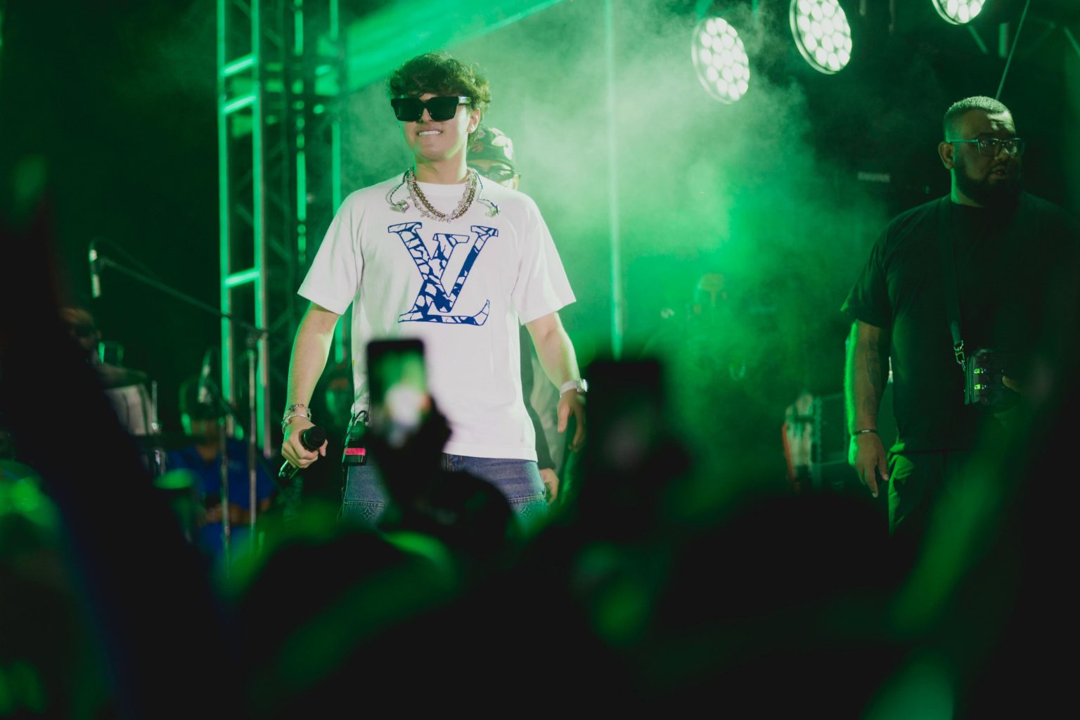 En punto de las 10 de la noche el joven cantante ingresó al escenario vestido con playera blanca, gafas oscuras y gruesas cadenas de plata alrededor de su cuello, acompañado de músicos, que pusieron a las y los asistentes a bailar a ritmo de banda con “El Muchacho Alegre” que de inmediato corearon las y los fanáticos.