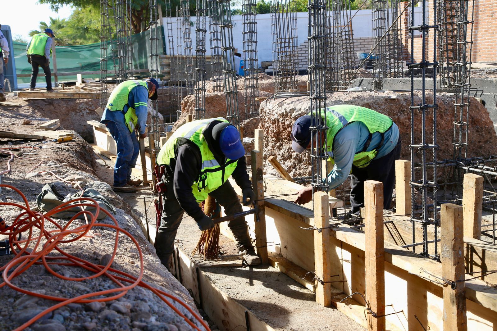 Actualmente, se están llevando a cabo trabajos de excavación, colado de plantillas, construcción de muros, impermeabilización de cimentación y colocación de acero de refuerzo, castillos y columnas.