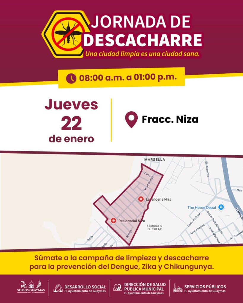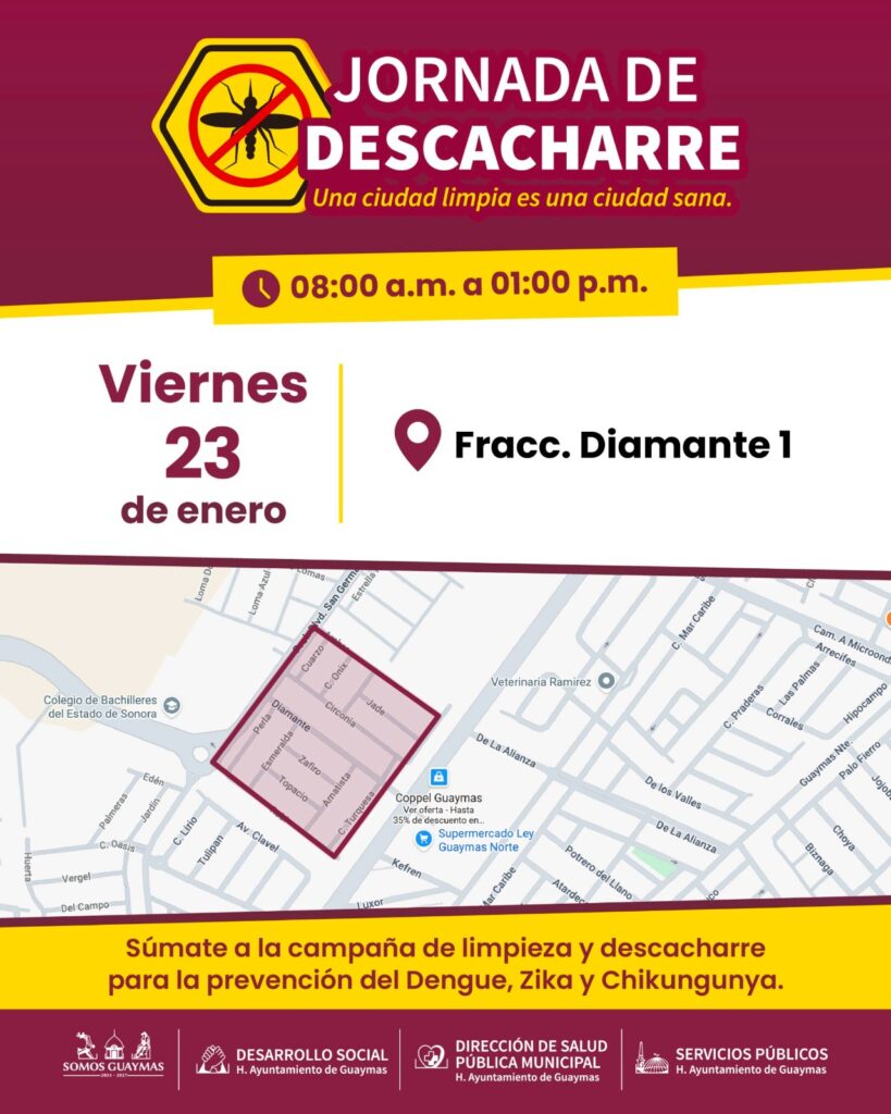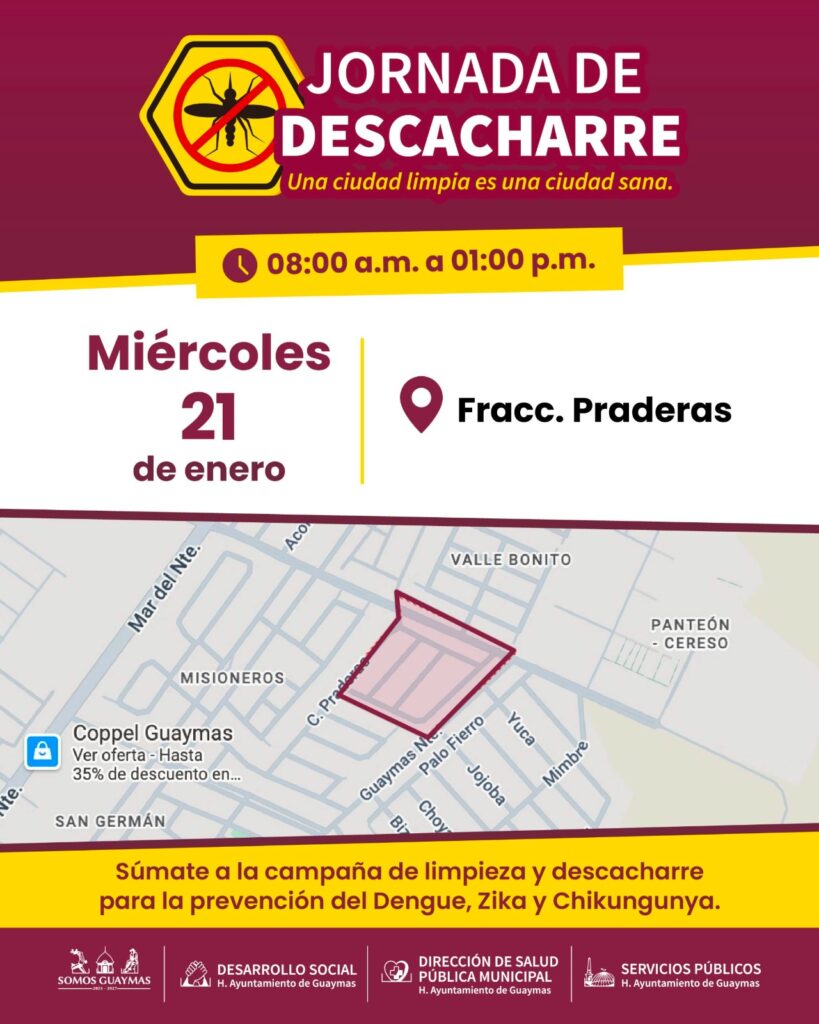 Del 21 al 23 de enero se realizará la primera jornada de descacharre de 2026 promovida por el Ayuntamiento de Guaymas a través de Desarrollo Social, Servicios Públicos y Salud Pública Municipal en las colonias Praderas, Niza y Diamante I, esto como parte de las acciones para prevenir el dengue, por ello, se invita a las familias a participar.