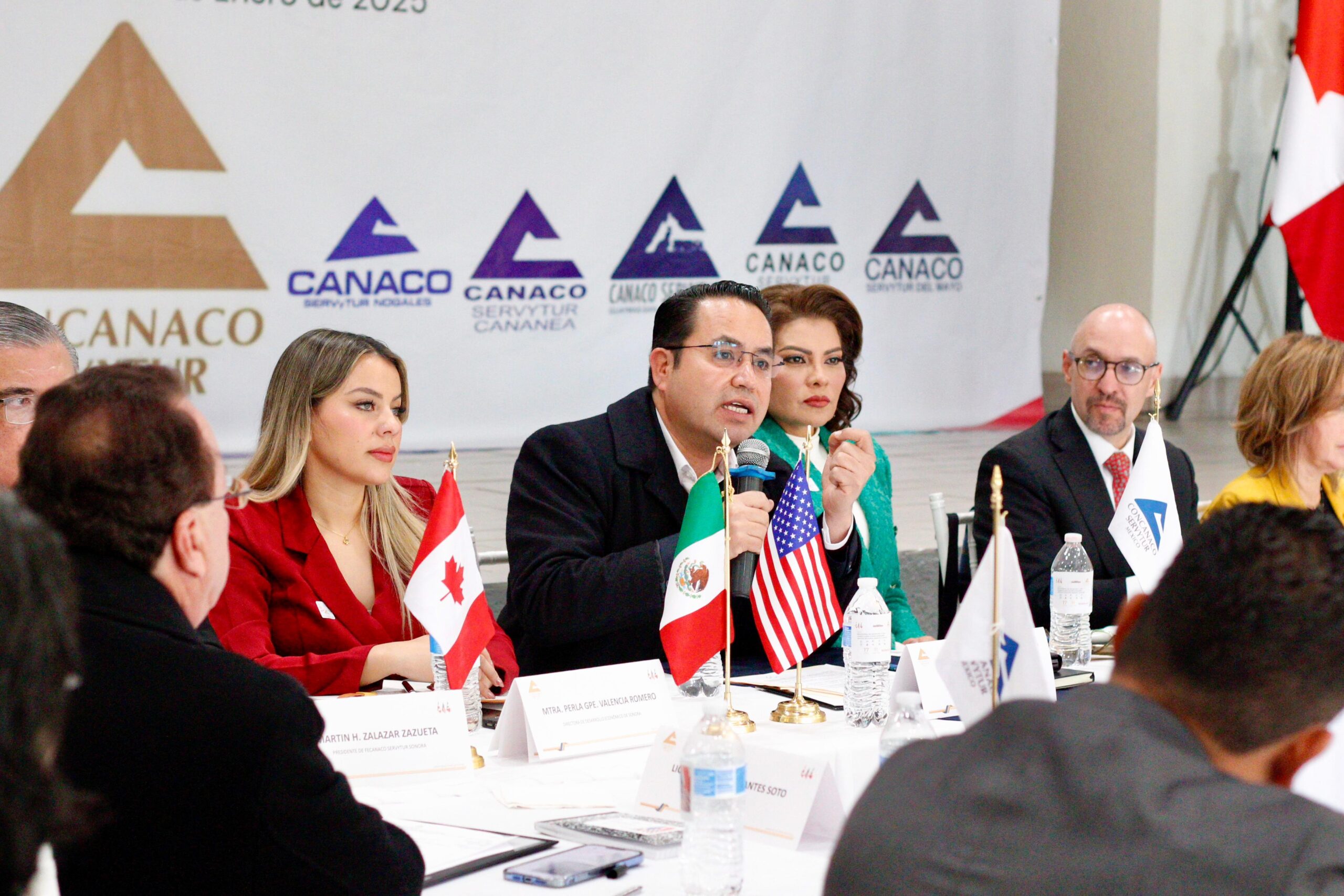 El evento contó con la presencia del presidente nacional de Concanaco, Octavio De la Torre; María Elena Gallego; Luis Rey Grimaldo, de Canaco Nogales, así como de funcionarios de gobierno, diputadas y diputados, quienes coincidieron en la importancia de fortalecer la relación comercial entre México y Estados Unidos.