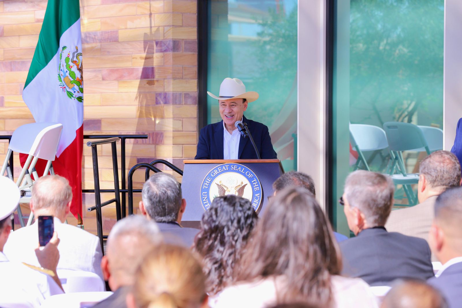 Durante la ceremonia de develación de la placa conmemorativa del nuevo consulado en Nogales, en la que encabezaron también, Tracy Thomas, directora general de Gestión de Construcción y Seguridad de la Oficina de Operaciones de Edificios en el Extranjero del Gobierno de Estados Unidos, y de la cónsul general de Estados Unidos en Nogales, Michelle Ward, el titular del Ejecutivo estatal refrendó la relación bilateral que existe entre Sonora y Arizona, unidos por una frontera que, más que dividir países, ha generado unión permanente para la relación económica, cultural, social y familiar entre ambas naciones.