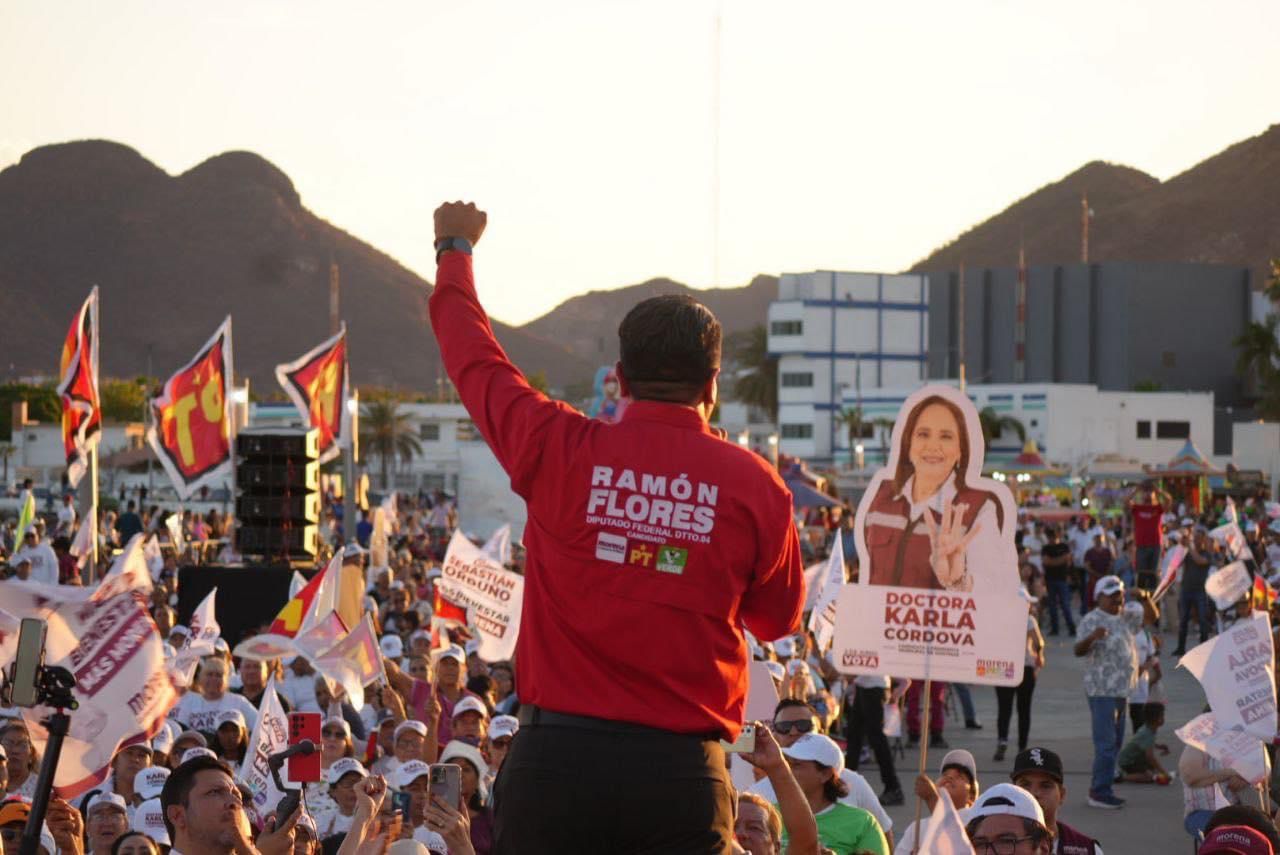 El candidato a diputado federal Ramón Flores, participó en el cierre de campaña de la doctora Karla Córdova, quién busca la reelección en el ayuntamiento del puerto, asistiendo el líder estatal de MORENA Julio Navarro y los candidatos al Senado Heriberto Aguilar y Sebastian Orduño, quien buscar por segunda ocasión la diputado local.